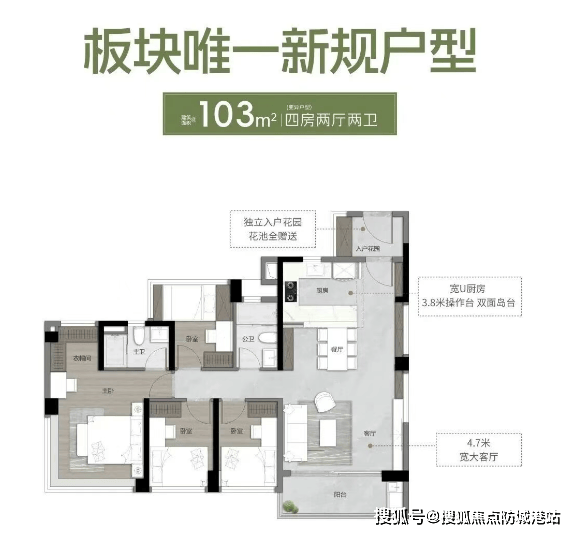 建面约103㎡户型:四房两厅两卫,带独立入户花园+7米阳台,270°瞰景主卧,兼顾功能与视野;