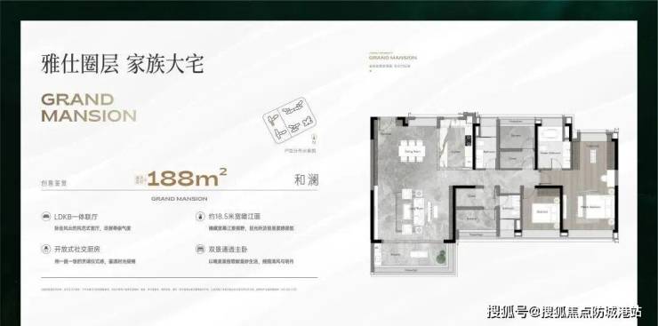 项目建面约 188㎡四房两厅三卫户型,是项目的顶级旗舰产品,专为广州高净值人群打造的终极改善大平层,对标一线城市顶豪的空间设计与居住标准。该户型采用五开间朝南设计,整体南向面宽超 18 米,可实现 270° 无遮挡南向瞰江视野,将珠江后航道的壮阔江景尽收眼底,是广州市场极为稀缺的南向江景大平层产品。户型采用 LDKB 一体化大方厅设计,打造约 60㎡的奢阔公共活动空间,可同时满足家庭日常居住、高端商务接待、家族聚会等多元场景需求。户型采用双主卧套房设计,南向主人房套房面宽超 5 米,配备独立步入式衣帽间、双台盆卫生间与全景观景飘窗,打造极致私密与舒适的主人专属空间;南向长辈套房、北向儿童房、多功能房均拥有阔绰的空间尺度,可全面适配家族全周期的居住需求,实现世代传承的家族居住理想。