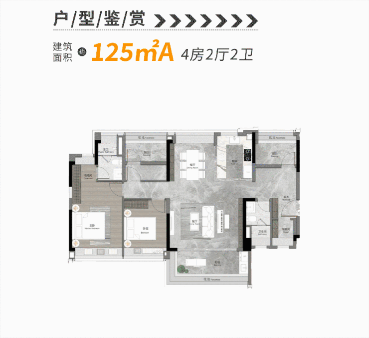 项目建面约 122-125㎡四房两厅两卫户型,位于项目 17-19 层的低密小高层楼栋,是海珠西极为稀缺的小高层改善产品,拥有更低的楼层、更高的得房率与更舒适的居住体验。该户型采用四开间朝南设计,全屋南北通透,整体户型使用率约 95%,实现了同等面积下的功能最大化,是刚改客群入主海珠芯低密社区的优质选择。户型采用 LDKB 一体化设计,餐客厨阳无缝衔接,打造阔绰的家庭互动空间,无多余的过道浪费,每一寸空间都得到充分利用。主卧采用套房式设计,配备独立卫生间与南向观景飘窗,保障居住的私密性与舒适度;三个次卧可分别适配儿童房、老人房、书房等功能,可全面满足三口之家到三代同堂的全周期居住需求,实现低门槛的品质改善居住体验。