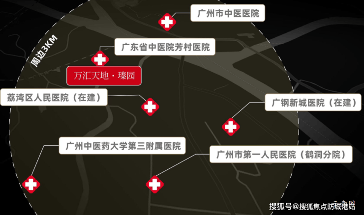 3公里范围内6所三甲医院,包括广州中医药大学第三附属医院,荔湾区人民医院,广州市中医医院,广州市第一人民医院,广钢新城医院。