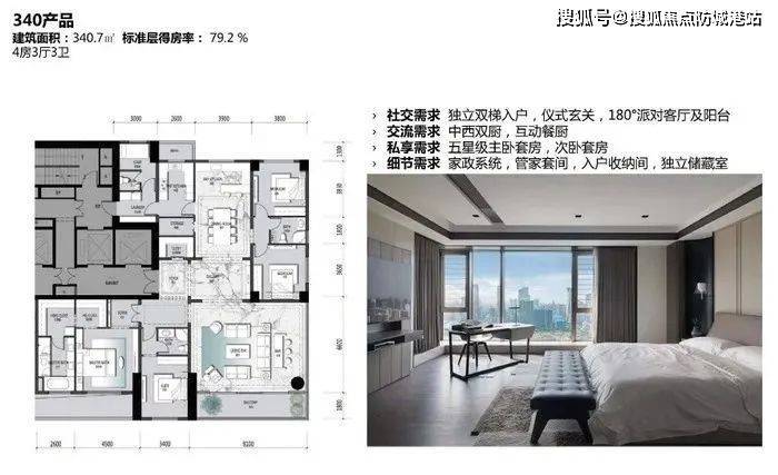 340.7㎡是项目340产品,为4房3厅3卫设计,得房率为79.2%。独立双梯入户,中西双厨,主、次卧套房。