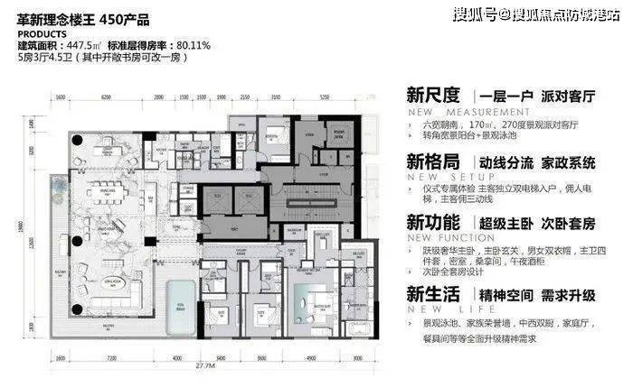 447.5㎡是项目革新理念楼王450产品,为5房3厅4.5卫设计(其中开敞书房可改为一房),得房率为80.11%。