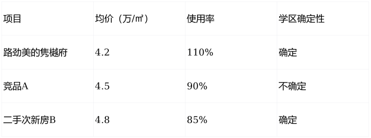 竞品对比:与周边竞品相比,隽樾府在学区、使用率、价格上均有显著优势。