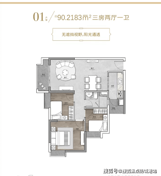 ✨90㎡三室两厅(总价约328万):三口之家首选!布局规整合理,U型厨房设计实用又贴心,预留了冰箱位置,做饭时操作动线流畅。次卧面积刚好能放下儿童床,公卫做了干湿分离设计,家人日常使用互不干扰,生活井然有序。