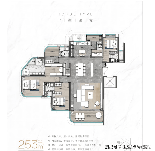 其中,建面约109㎡三房户型,是项目的高性价比之选,户型布局紧凑合理,空间利用率高,兼顾实用性与舒适性,适合刚需改善家庭,既能满足日常居住需求,又能享受滨江大城的全能配套;建面约135㎡四房户型,主打东南向滨江,采光通风俱佳,视野开阔,能最大限度享受江景资源,户型布局方正,动静分区明确,适合改善型家庭居住,满足全家居住的舒适需求;建面约161㎡五房户型,定位顶奢江景同堂户型,空间尺度阔绰,能满足多代同堂的居住需求,让家人各得其所,同时拥有极佳的江景视野,彰显高端人居品质;建面约253㎡一线滨江传世大平层,作为项目的顶级户型,拥有极致江景视野与阔绰空间尺度,270°环幕全景落地窗,将珠江美景尽收眼底,打造专属塔尖人士的尊贵居住体验。