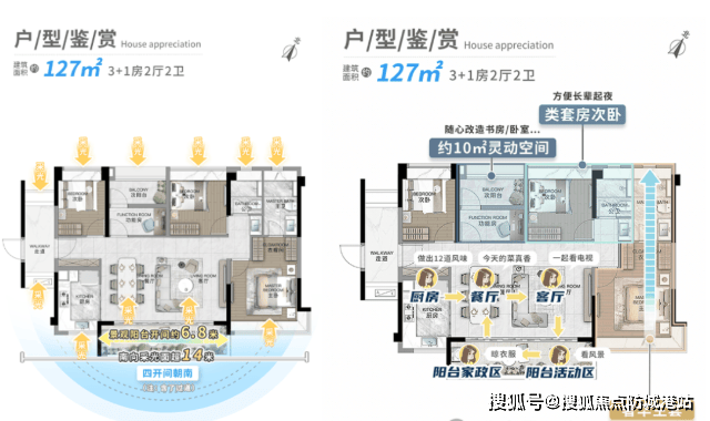 建面约127㎡3+1房2厅2卫(横厅),以更大的空间尺度,满足改善型置业者的需求,彰显品质与格调。超大赠送面积,所有房间赠送飘窗,阳台面积赠送一半,极具性价比,让业主花更少的钱,享受更大的空间;四开间南向采光,约13.2m超长南向采光面,让室内每一个角落都能沐浴在阳光之下,通风效果极佳;大面宽南向大横厅,约6.8m面宽南向阳光大横厅,可实现多种模式切换,既能作为家人欢聚的客厅,也能作为休闲娱乐的空间,满足业主的多样化需求;双面景观阳台+满飘窗设计,约6.8m面宽超大阳台,景观资源最大化利用,站在阳台上,可将园林美景、城市风光尽收眼底;豪华主卧套房,超大270°转角飘窗,视野开阔,让业主在卧室中就能欣赏到优美的景色,享受惬意的休憩时光。