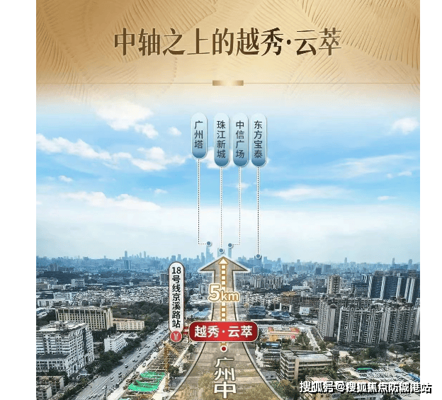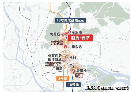 越秀·云萃地理位置优越,距离珠江新城仅5公里,自驾可通过广州大道或沙太路快速到达。同时,它是双地铁项目,家门口即是18号线京溪路站,步行至3号线梅花园站也只需800-900米。乘坐18号线可直达琶洲、珠江新城、天河北等地,无需换乘,极大地方便了居民的日常出行。