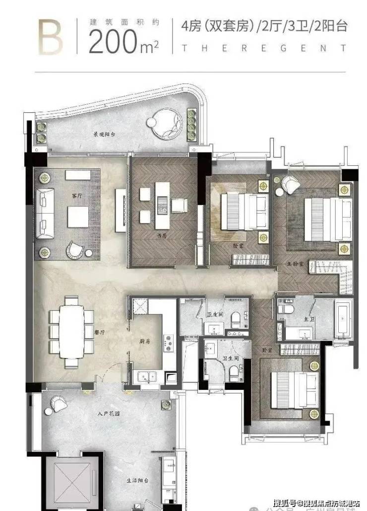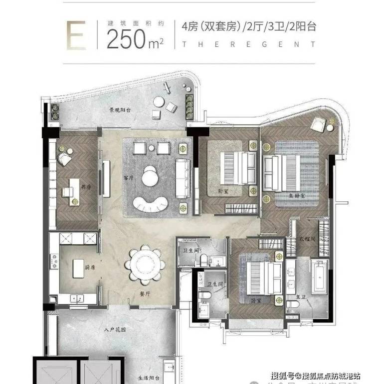 建面约250㎡:4房(双套房)2厅3卫2阳台拥