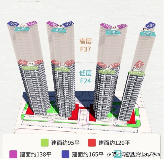 越秀·江湾潮起严格遵循广州最新住宅设计规范,阳台占比高达20%,综合使用率突破120%,远超市场平均水平。项目由4栋37层住宅组成,采用高低分区策略:低区(3–23层)主打95–116㎡四房,高区(25–37层)聚焦131–195㎡瞰江大平层,产品线覆盖全生命周期居住需求。