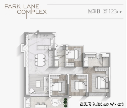 【一期悦璟B户型 建筑面积约123㎡】:该户型主打南向卧室设计,厅卧空间可灵活改造,能够根据家庭需求调整为书房、儿童房等,满足全生命周期居住需求,四季都能享受充足采光。户型采用半开放式中西厨设计,搭配多用途中岛,LDKG设计让客餐厨阳形成连贯空间,生活起居更加从容有序。约6.6米双面宽阳台,最大化延伸景观视野,闲暇时可俯瞰小区园林美景,享受惬意时光。豪华主卧套房设计,配备独立梳妆台和主卫,保障了居住的私密性和尊崇感,满足改善家庭对居住品质的追求。
