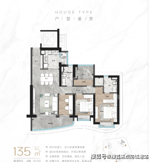 135㎡的王牌东南向滨江四房,采用了东南朝向的设计,能够充分享受阳光的照射,室内明亮温暖。该户型的景观阳台宽敞明亮,可直观江景,让业主在家中就能感受到珠江的魅力。
