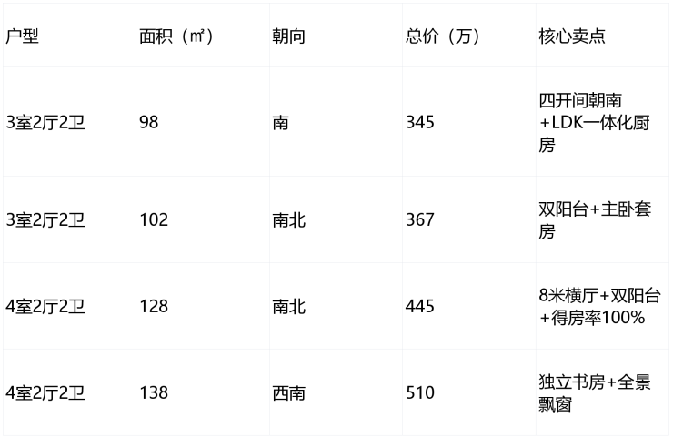 A:主力户型为98-138㎡三至四房,部分户型得房率超100%。