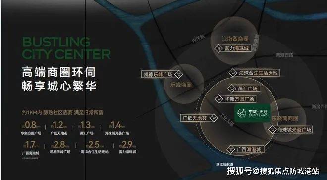 中建·天钰处于海珠与佛山的双城交界核心,工业大道中轴串联起广州老城与广佛新城的资源。向西通过广佛线15分钟直达佛山千灯湖,享受双城消费红利;向东20分钟进入海珠中心区,感受江南西、昌岗的商业繁华;向北30分钟抵越秀,体验北京路的广府文化;向南衔接番禺万博商圈,拥抱现代商业综合体。项目3公里内8大商圈环绕,从燕汇广场的日常消费到乐峰广场的高端购物,从江南西的老字号茶楼到太古仓的夜生活,商业形态丰富多元。这种“双城枢纽+多商圈覆盖”的区位,让居者轻松切换多元生活场景:工作日乘地铁到琶洲上班,周末带家人去千灯湖游玩,傍晚在江南西聚餐,或是在社区花园享受静谧时光,真正执掌广佛都会圈的万象生活,在繁华与宁静间找到完美平衡。