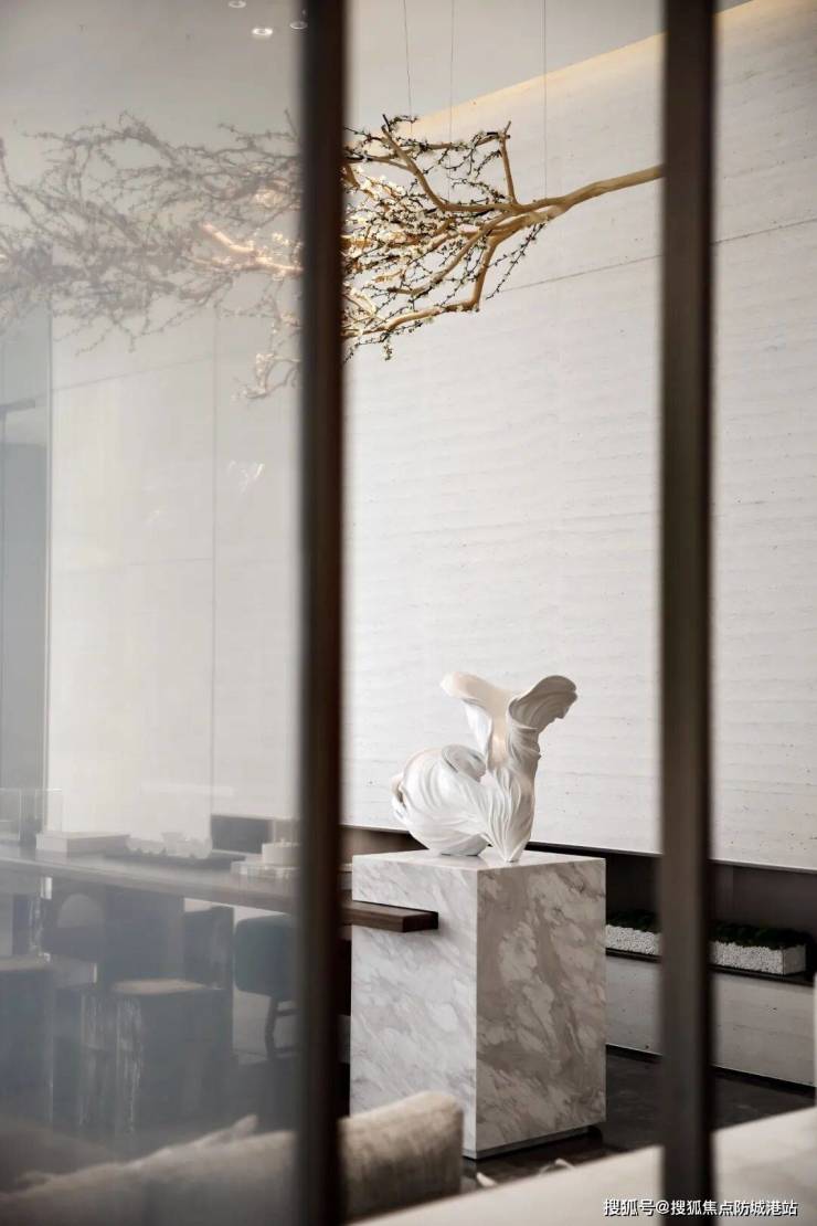 △偏厅花朵雕塑,将绽放的瞬间,用艺术笔法将其定格。花朵在它柔嫩的躯体之内,温柔、娇艳、嚣张......有着数种迷人的力量。△水吧区柜内陈列用阵列的摆放手法,通过视觉上的秩序感,使空间富有层次。洽谈桌上的青苔有蜻蜓轻轻停留,成为访客落座时的小惊喜,在人与人的交流中带去一丝春意。
