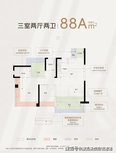 88㎡三房:创新双开间阳台设计,主卧赠送步入式衣帽间,空间灵活可变;