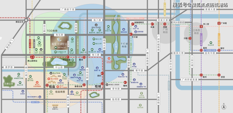 项目位于禅桂核心板块,千灯湖及祖庙双商圈中心,3号线、5号线双地铁交汇,地铁中山公园站旁,高铁佛山站TOD,是集交通、商业、教育、医疗、休闲等配套于一体的舒适纯居社区。