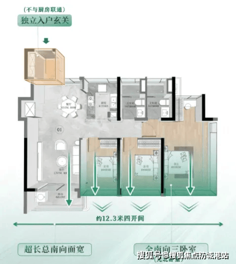 建面约90㎡ 南向三房:12.3米南向面宽,餐客连通6米阳台,主卧270°环幕观景,空间感媲美传统100㎡产品。