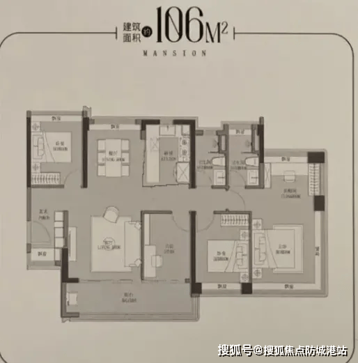 建面约106㎡ 四房:双轴线南北通透,超130%使用率,独立入户玄关,三代同堂无压力。