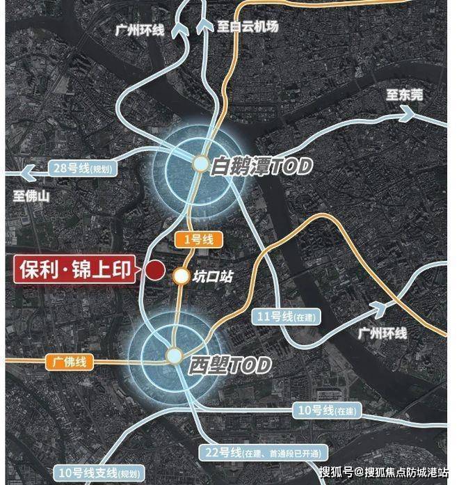 项目交通网络十分完善。距 1 号线坑口站直线距离约 880 米,步行 13 - 15 分钟可达,通过 2 站即可快速抵达双 TOD(西朗及芳村),能够迅速通达海珠、越秀等区域,畅享 30 分钟城芯生活圈。周边道路交通及公交路网同样发达,花地大道、龙溪大道、环城高速等干线环绕,为自驾出行提供了极大的便利,无论是日常通勤还是外出旅行,都能轻松实现高效出行。