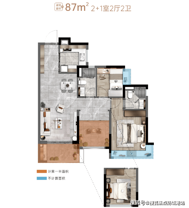 87㎡ 三室两厅两卫:三开间朝南,采光充足,空间利用率高。