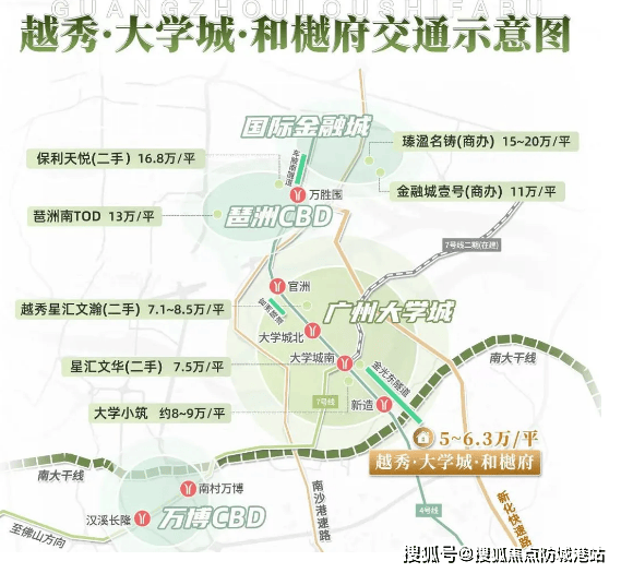 项目坐落于大学城二期 - 国际创新城板块,处于 “一核两翼” 空间结构的核心地带,北接生物岛、南连南岸起步区,与 13 所高校为邻。交通上,步行 900 米即达 4 号线新造站,4 站到万博、琶洲,5 站抵金融城;南大干线与金光东隧道已通车,5 分钟直达万博 CBD 与大学城一期,实现 “地铁 + 自驾” 双高效通勤。