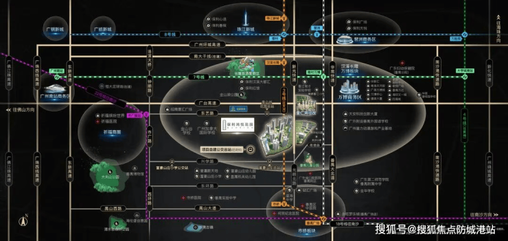 5横交通包括新光快速、华南快速、番禺大道、市广路、东新高速,5纵交通涵盖汉溪大道、南大干线、广明高速、东环路、兴业大道,自驾出行极为便捷。从项目出发,开车出门即接入新光快速,10分钟即可抵达万博商务区,享受万达、天河城等商业配套;25分钟可达琶洲,30分钟直达珠江新城,满足通勤与商务出行需求。