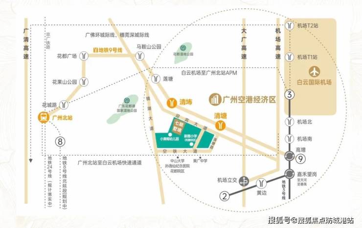花都区合和新城雄踞空港经济圈核心,坐落于迎宾大道与镜湖大道交汇处,交通便捷度拉满。据*百度地图实测*,项目距地铁9号线清塘站约671米,步行仅需8分钟,距清布站834米,双地铁覆盖;从清塘站搭乘2站即可抵达白云国际机场,换乘3号线直达珠江新城CBD,全程仅需30分钟。周边坐拥迎宾大道、镜湖大道等多条主干道,自驾25分钟可达白云新城,40分钟畅达天河CBD,尽享空港经济与主城资源双重红利。