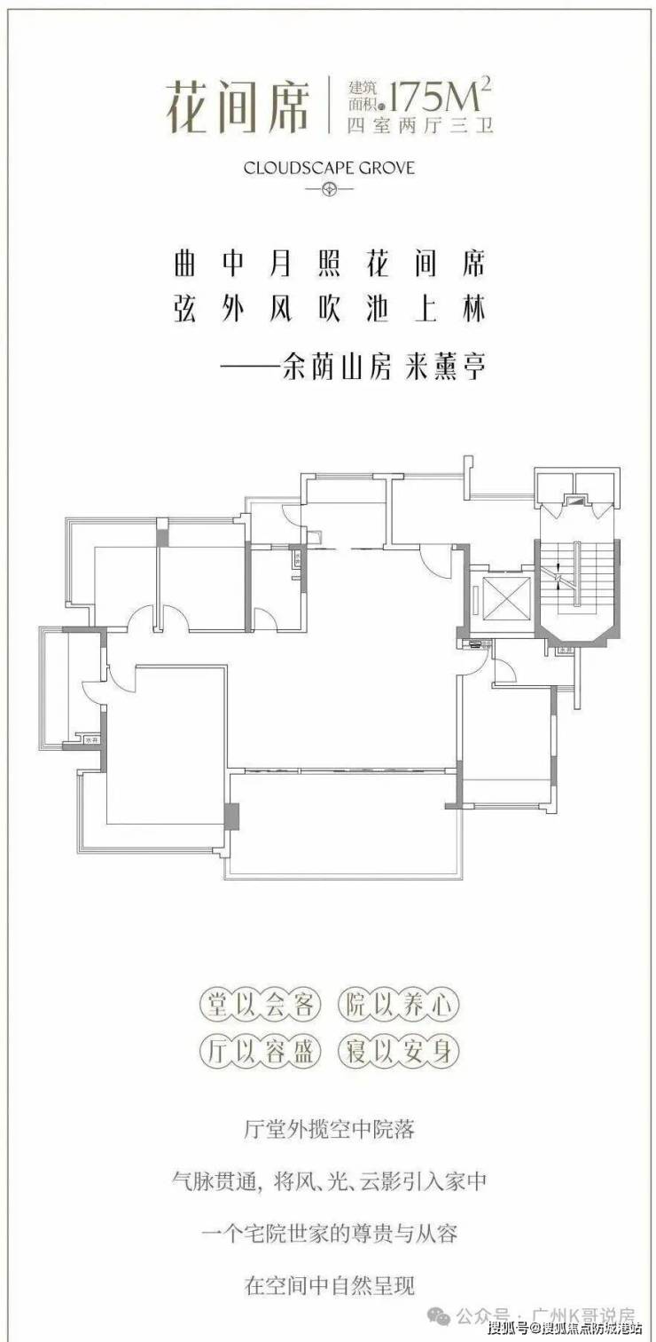 建面约175㎡ 4房3卫双主套:户型格局方正,南北通透,空间尺度更大,舒适度更高。四房三卫的布局,满足多人口家庭的居住需求,双主套设计,让长辈、子女都能拥有独立的私密空间;客餐厅采用大横厅设计,连接超大阳台,采光通风效果极佳,视野开阔,将社区园林景观尽收眼底;厨房采用U型设计,操作空间充足,方便家人烹饪;各个房间布局合理,动静分离,休息区与活动区互不干扰,提升居住舒适度。
