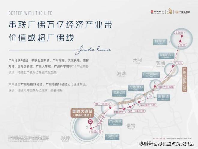 中海·汇德里,作为广州地铁7号线TOD项目的代表作,地处广州和佛山的核心交界地带,位于广州地铁7号线美的大道站上盖,享受着前所未有的地铁枢纽便捷交通,成为广佛区域不可多得的精品物业。项目依托广州7号线的快速交通优势,快速接入大湾区多个核心区域,实现了大湾区“一站式”畅通,能够轻松连接广佛、珠江新城、白云机场等重要商务与交通节点。7号线作为广佛连接的第二条地铁线路,不仅将北滘新城、广州南站、万博CBD、国际创新城等重要产业商务极点串联,更构建了一条“广佛万亿经济产业带”,这为汇德里提供了雄厚的产业背书和无限的发展潜力。