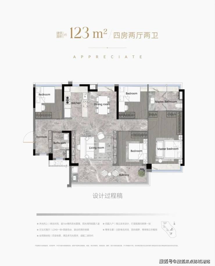 项目占地面积广,总户数为2262户,社区设计强调低密度与高绿化率。项目的在售楼栋提供多种户型选择,包括103㎡、123㎡等,梯户比设计为2梯4户,容积率适中,保证了业主的居住舒适度。