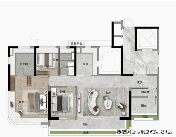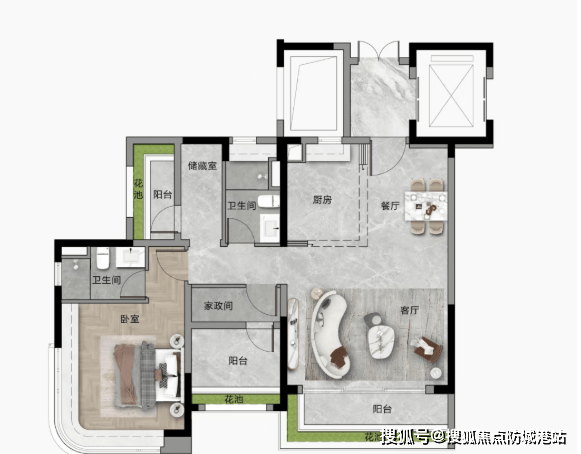 而约108-110㎡三房,则是片区极为稀缺的“低门槛上车”选择:带入户花园设计,空间使用率显著优于市场同类产品;约4.9米开间客厅+主卧270°飘窗,全屋采光面约12米,在紧凑面积内实现奢阔体验。