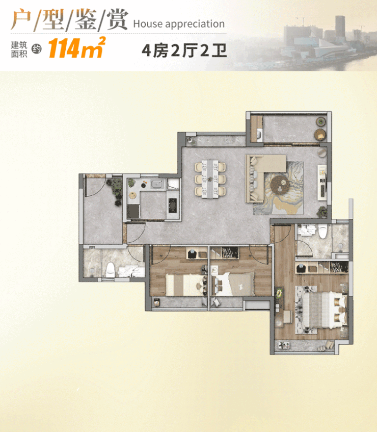 四房朝阳,东南朝向,巨幕采光面使得每间房都能感受到阳光与江景的美好结合。