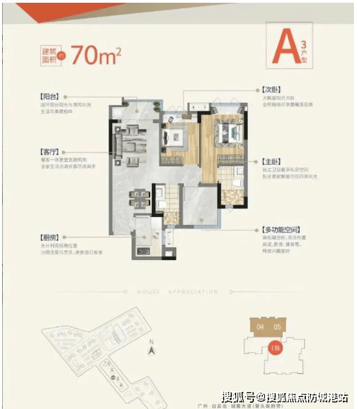 80㎡三房两卫:双卫设计提升私密性,客厅开间超3.5米,空间感强;