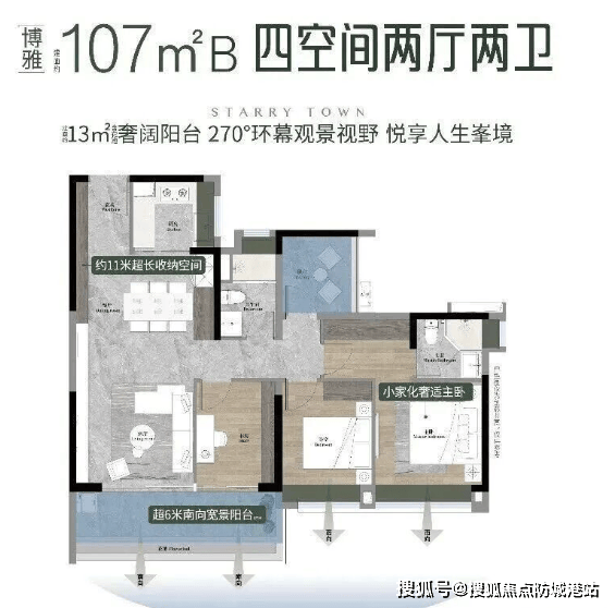 107㎡A/B两款四房:A户型设南向观景玄关,客厅主卧双南北对流;B户型为主卧带独立衣帽间,超11米收纳系统,适配二胎家庭;