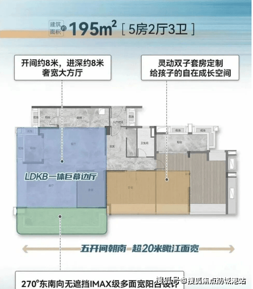 195㎡大四房两厅两卫(江境户型):高区顶豪产品,需验资500万预约参观。阳台长度达8米,LDK客餐厅面积超70平方米,两侧观江面总长约16米,打造巨幕江景视野,空间感堪比酒店江景宴会厅。五开间朝南、南北双阳台、南向双套房设计,兼顾圈层社交与家庭居住需求,尽显高阶人居质感。