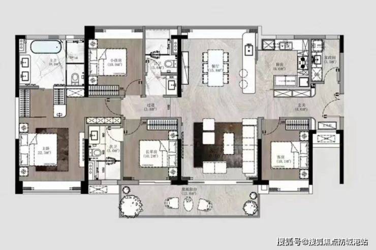 180㎡四房则采用专梯专户设计,7 米横厅连接同尺寸阳台,部分高楼层房源能远眺江景
