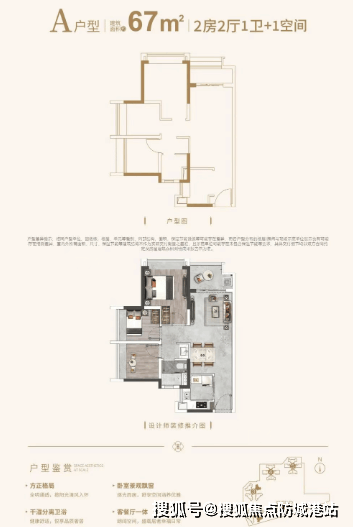 67㎡两房两厅一卫 + 1 空间户型,是刚需上车优选户型,总价 220 万起,以低门槛实现中心区置业。户型全明通透设计,采光通风效果俱佳,客厅连接观景阳台,延伸空间尺度,揽阳光清风入怀。主卧、次卧空间方正,满足日常居住需求;额外 + 1 空间设计,可改造为儿童房、书房、储物间或休闲区,同等面积实现更多功能,适配不同家庭阶段需求。小户型大功能,低总价高实用,无论是单身贵族、新婚夫妇还是刚需小家庭,均能满足居住需求,轻松实现安家梦想。