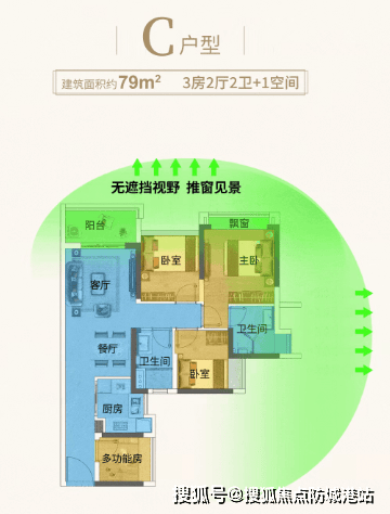 79㎡三房两厅两卫 + 1 空间户型,是改善型刚需优选,空间尺度升级、功能布局完善,满足三口之家或多孩家庭居住需求。户型采用餐客一体设计,朗阔公共空间,增强家人互动交流,同时提升空间通透感。三房设计 + 1 灵动空间,主卧配备独立卫生间,保障居住私密性与便利性;次卧空间充足,满足子女居住需求;+1 空间可灵活改造,满足家庭成长需求。双卫生间设计,避免早高峰使用拥堵,提升居住效率与舒适度,高拓空间设计,让 79㎡面积实现四房功能,性价比拉满。