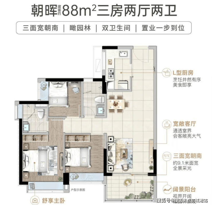 项目目前主推两类房源,均为官方备案合规户型,满足不同家庭需求。一类为 3 栋现房尾货,楼栋总高 46 层,3 梯 6 户设计,主力户型为 88㎡三房两卫,毛坯交付,空间方正,动静分区合理,三房格局适配刚需小家庭,功能性十足。
