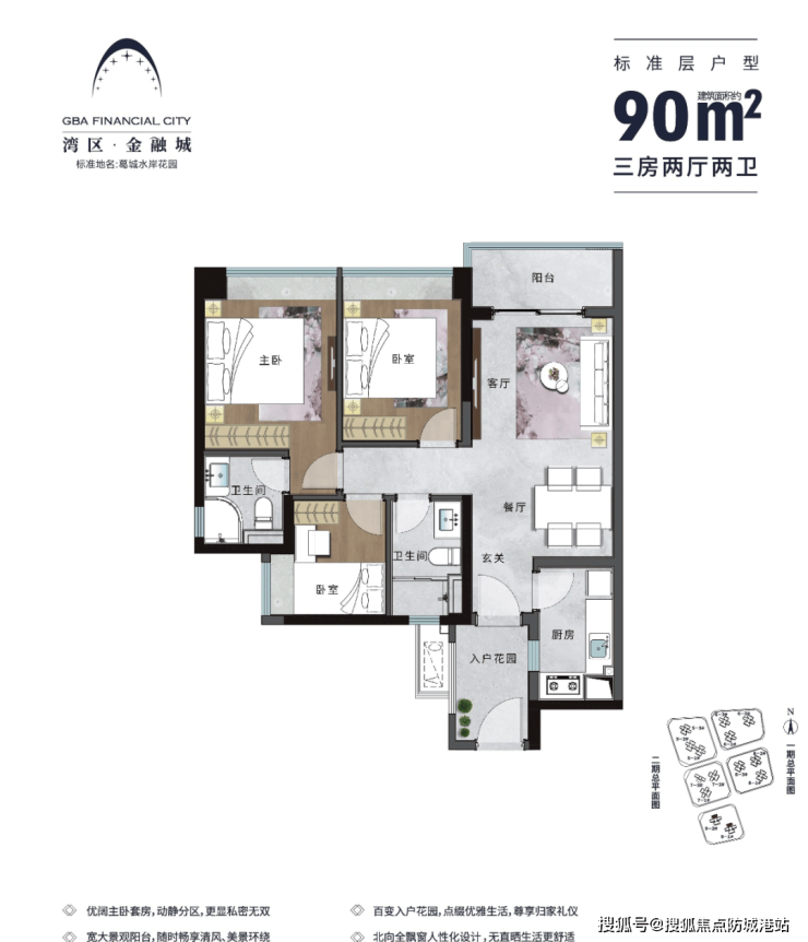 能建·湾区金融城目前主推二期7地块和9地块的多种户型,涵盖从约70平方米至约142平方米的两房至四房住宅。特别是约90平方米的三房两厅两卫户型,部分设计有入户花园,优阔主卧套房与宽大景观阳台相结合,提供了舒适的居住体验。而约137平方米和138平方米的四房户型则做到了南北通透,通风采光俱佳,超大景观全飘窗设计更显奢华。