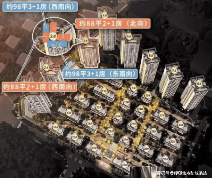 当前主推产品集中在3栋住宅楼,主力户型为88㎡三房两卫与98㎡四房两卫,精准切中刚需刚改人群的核心诉求。