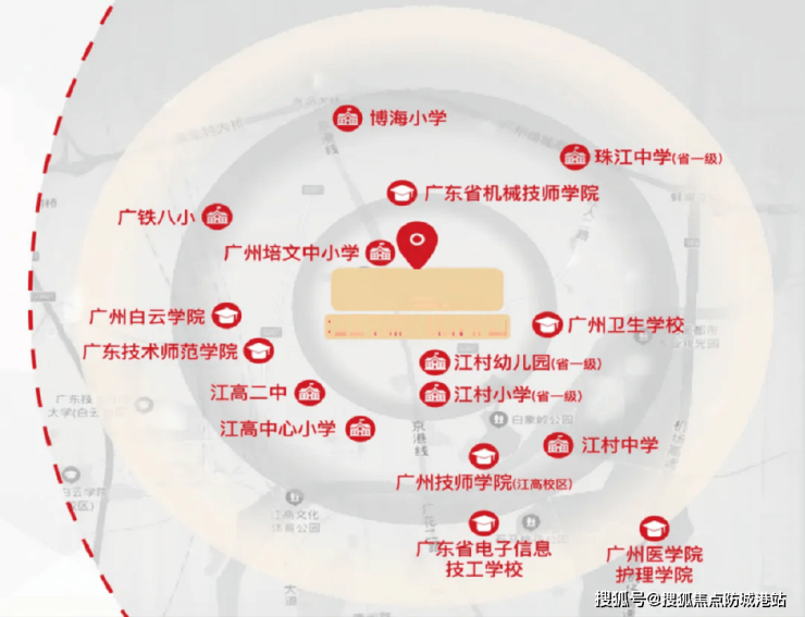 项目内部配建广州培文外国语学校(规划小学36班、初中48班),实行小班化、国际化教学模式;另设18班公立幼儿园,实现从3岁到15岁的全龄段教育覆盖。周边还有江村小学、广铁八小等老牌公办学校,教育资源丰富且多元。