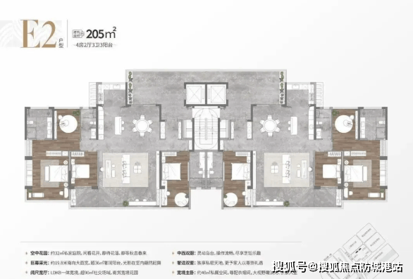 建面约205㎡户型:中西双厨+灵动岛台+约32㎡庭院+约19.8米南向大面宽+超36㎡阳台+超90㎡社交空间+约40㎡主卧私人空间+双套房