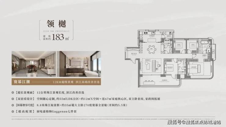 项目主打建面约128㎡、138㎡、183㎡、238㎡四房大平层,全部精装修交付,使用率超100%。128㎡四房南北通透,空间利用率高,适合实用型改善家庭;138㎡东向望江四房,LDK公区约50㎡,搭配约20㎡X空间,形成近70㎡家庭核心区,满足多元生活需求;183㎡、238㎡大平层东南向一线望江,100%直面珠江,配备270°转角全景外平推窗,观景视角延伸约30%,138㎡以上户型望江率达90%。