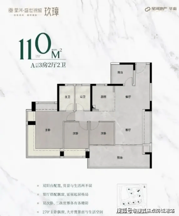 110㎡4 房:主朝向西南,采光通风极佳,客厅、阳台和主卧尺度全面超越二期,空间开阔大气,彰显尊贵风范,适合改善家庭;