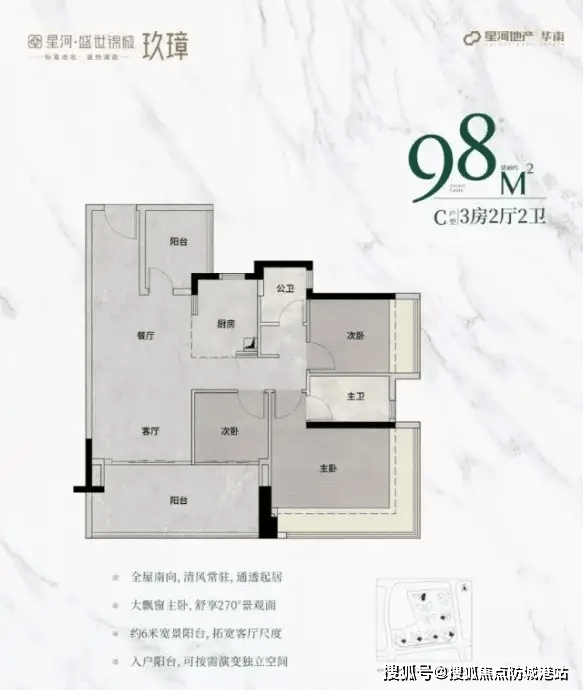 98㎡3+1 房:主朝向朝南,主卧配备 270° 无柱飘窗,视野开阔,次卧和阳台尺度大幅增加,满足日常休闲与晾晒需求,适合刚需家庭;