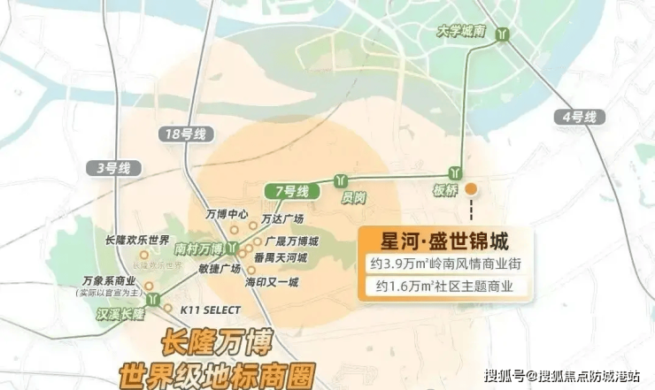 星河盛世锦城精准落位于番禺南大干线经济带黄金财智走廊,地处万博・余荫山房北侧・板桥地铁站旁,依托长隆万博世界级商圈辐射,占据粤港澳大湾区核心发展节点。2025 年,长隆万博商圈成功入选 “世界级商圈 TOP30 指数榜单”,标志着该商圈正式迈上世界级发展台阶,成为大湾区商业发展的新标杆。