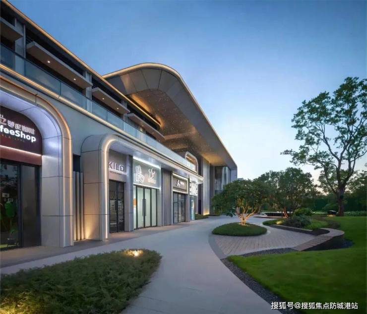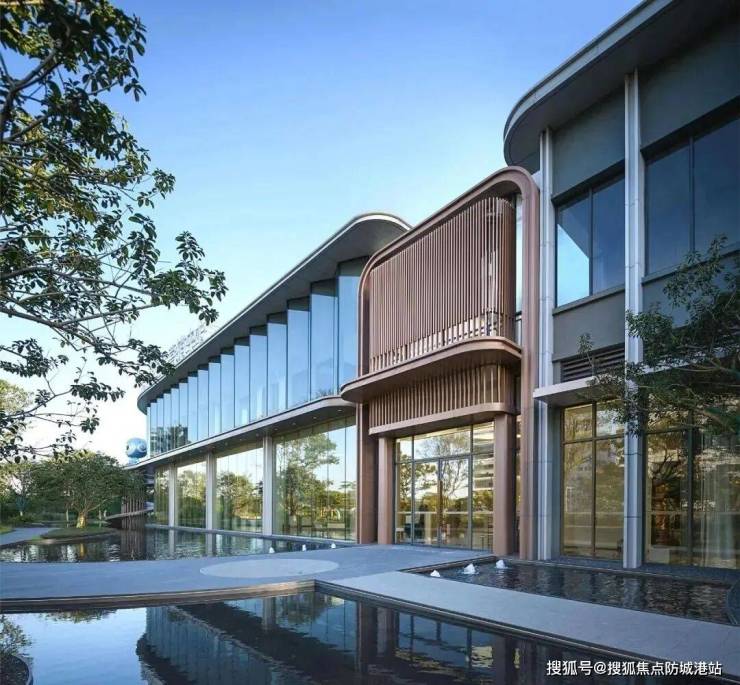 外立面:现代极简风格,大面积玻璃幕墙搭配香槟色、银白色铝板线条,虚实交织,曲线金属予了轻盈流畅的弧形美感,打造兼具未来感与时尚感的落地形制。