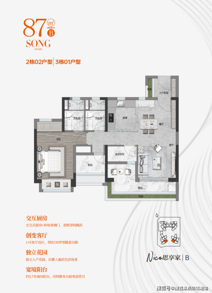 ▪南北对流 ,三开间朝南望中心花园,1+X客厅设计,客厅开间约3.8米