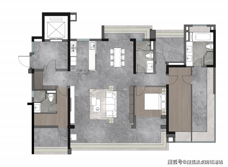 :LDKG世界会客厅设计,南北通透,中西双厨,双套房配置,主卧配270°转角飘窗、独立衣帽间与双台盆卫浴。